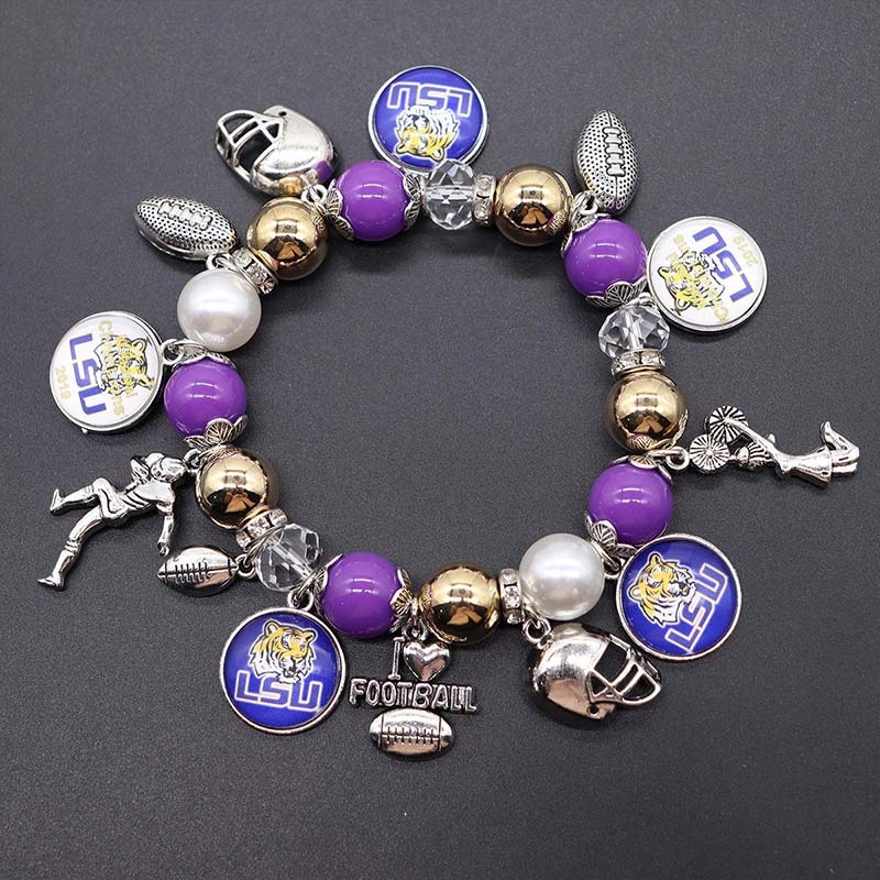 - Main Body: Composed of colored beads (orange/black/pearl white) + clear crystal beads, paired with alloy pendants featuring team elements (including the team logo, football, helmet, player silhouette, etc.).