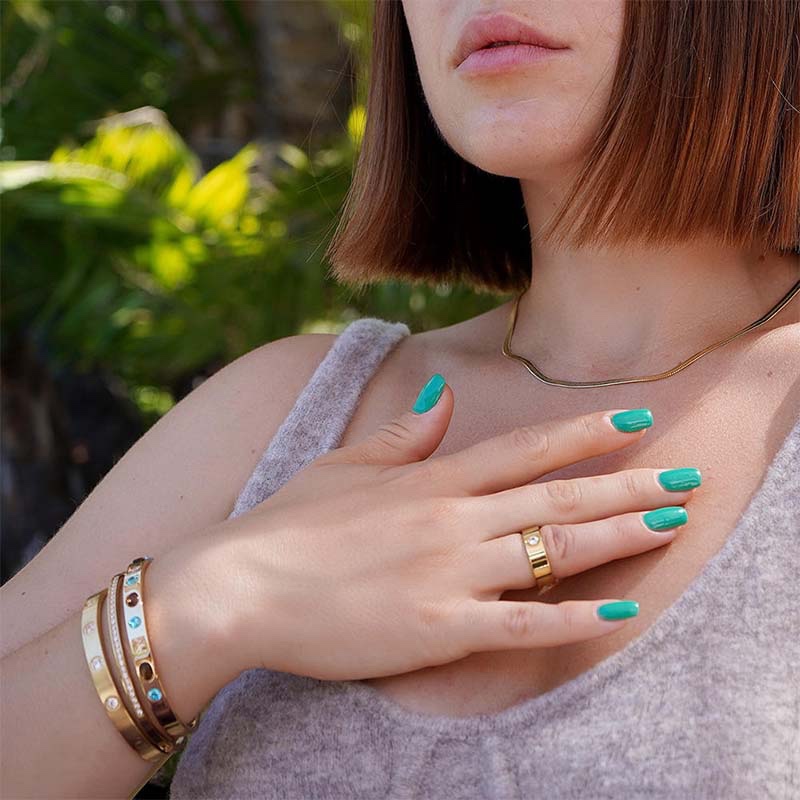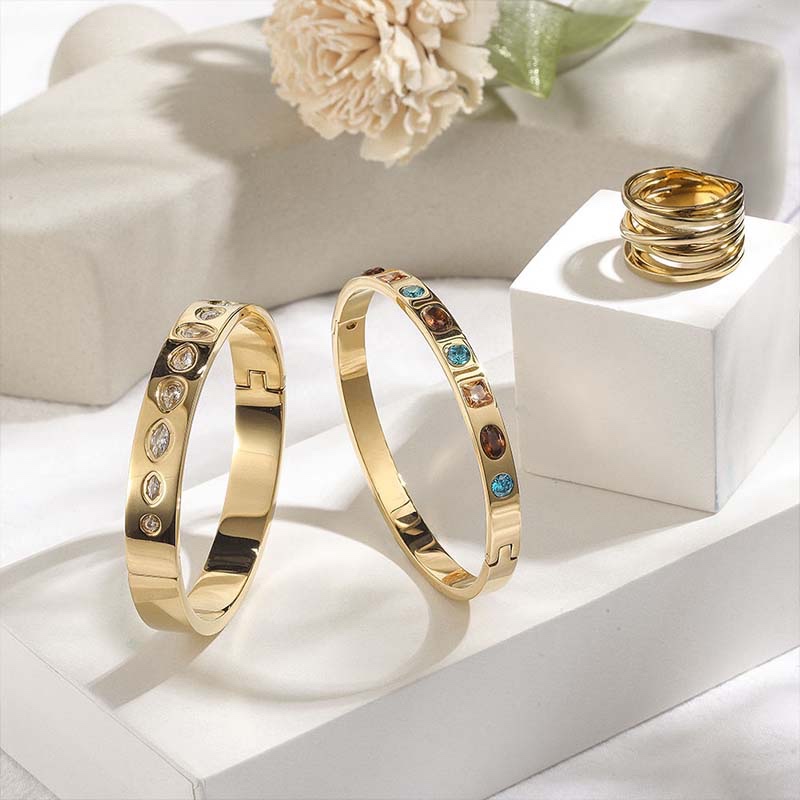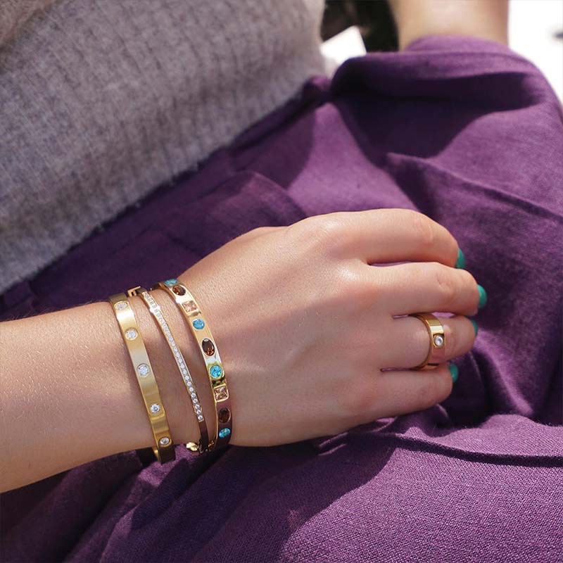 - Design Highlights: Centered around “thin-band bangle + mixed colorful gemstones,” the slim shape fits snugly on the wrist for a lively look. The multi-color gemstone color block adds fresh vitality, and different cut shapes enhance detail layers; the gold base better highlights the gemstones’ color texture, making it a styling focal point even when worn alone.