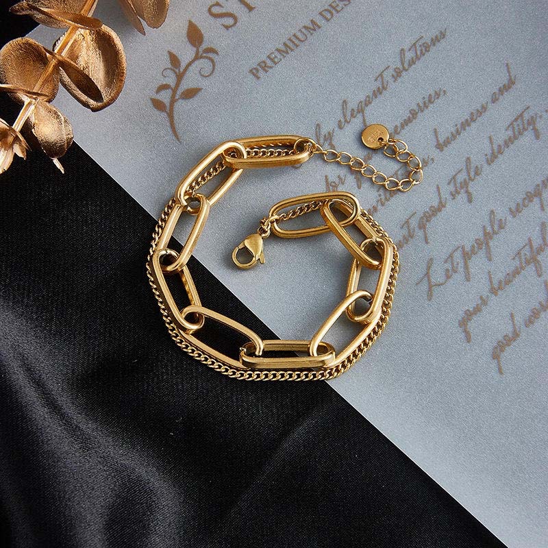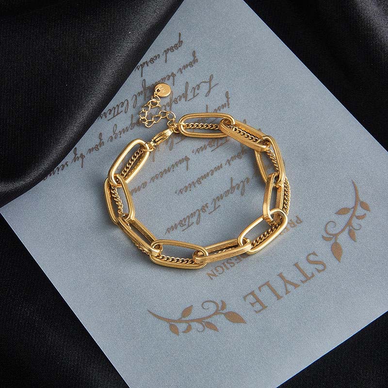 - Made of gold-plated alloy, it features a double-layer design: the outer layer is a wide, oval-link Cuban chain, while a slim chain is interwoven through it. The finish blends matte and polished textures for substantial, layered depth.