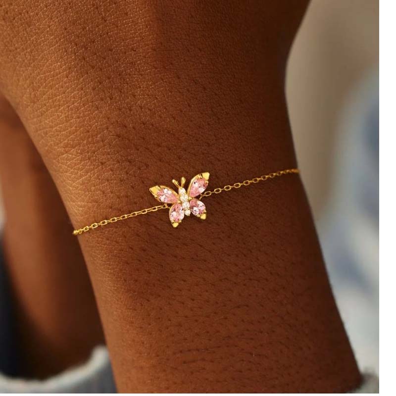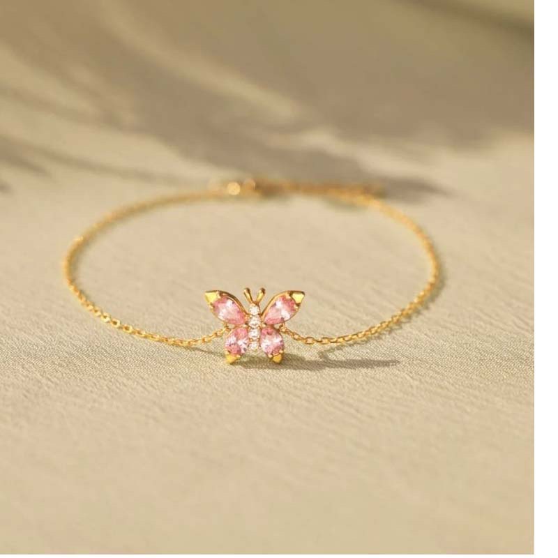 Crafted with a delicate gold-tone chain,the centerpiece is a 3D butterfly charm — its wings are inlaid with pastel pink crystals,and the body is adorned with tiny white sparkles,making it look vivid and dreamy.