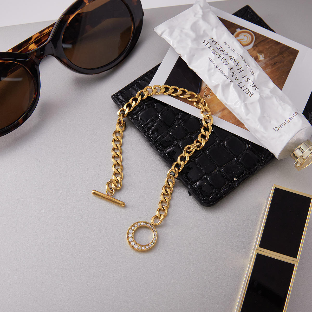 - Cuban Link + Clasp Element: The chain features a classic Cuban link texture (thick links + 3D feel), paired with a diamond-inlaid circular clasp. The gilded hue amplifies the vintage edgy vibe, while the clasp’s diamonds add a refined highlight;