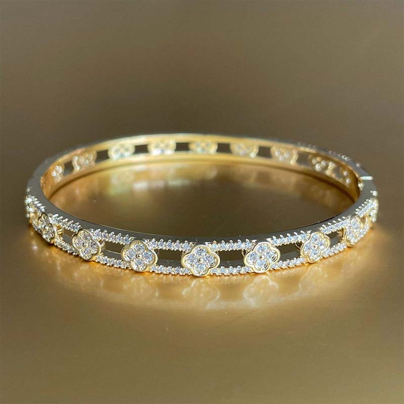 • Materials & Craftsmanship: Made of gold-plated/silver-plated alloy + fully inlaid imitation diamonds, the bangle is framed with fine beaded edges and evenly decorated with four-leaf clover-shaped full-diamond accents. The imitation diamonds are transparent and sparkling, while the beaded edge details add sophistication; paired with a push-button clasp, it opens and closes easily and securely, with an overall delicate and premium texture.