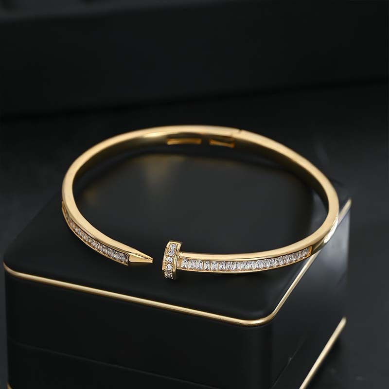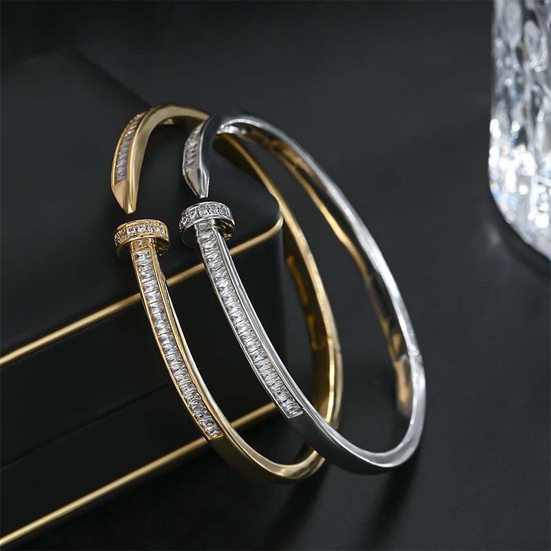 - Made of alloy (silver: rhodium-plated; gold: gold-plated), the bangle is inlaid with baguette-cut zirconia on the main body, with a nail-shaped opening (the nail head is fully encrusted with round micro-pavé stones). The setting is tight and delivers rich shimmer.