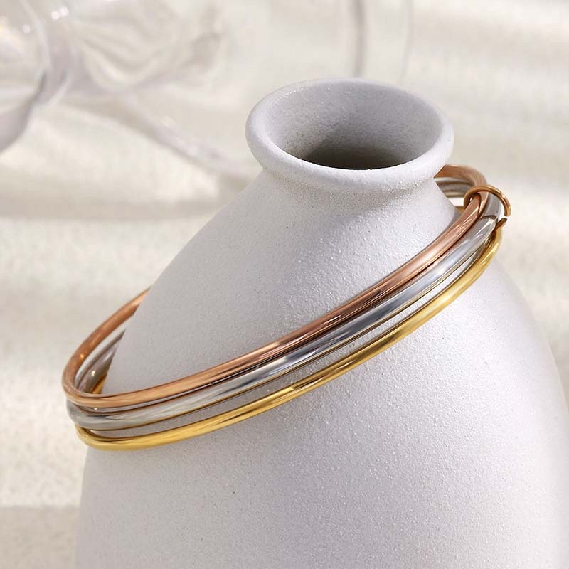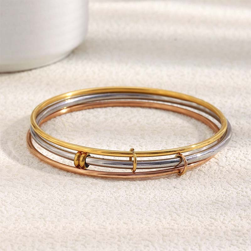 - Materials & Craftsmanship: Made of tri-color plated alloy, it consists of three thin bangles (in gold, silver, and rose gold) stacked together. The surface is glossy polished for a smooth metallic luster; it’s equipped with a sliding adjustment clasp, allowing flexible resizing of the bangle opening to fit different wrist sizes.