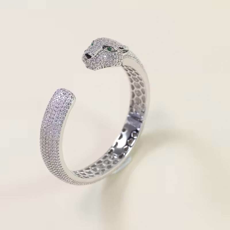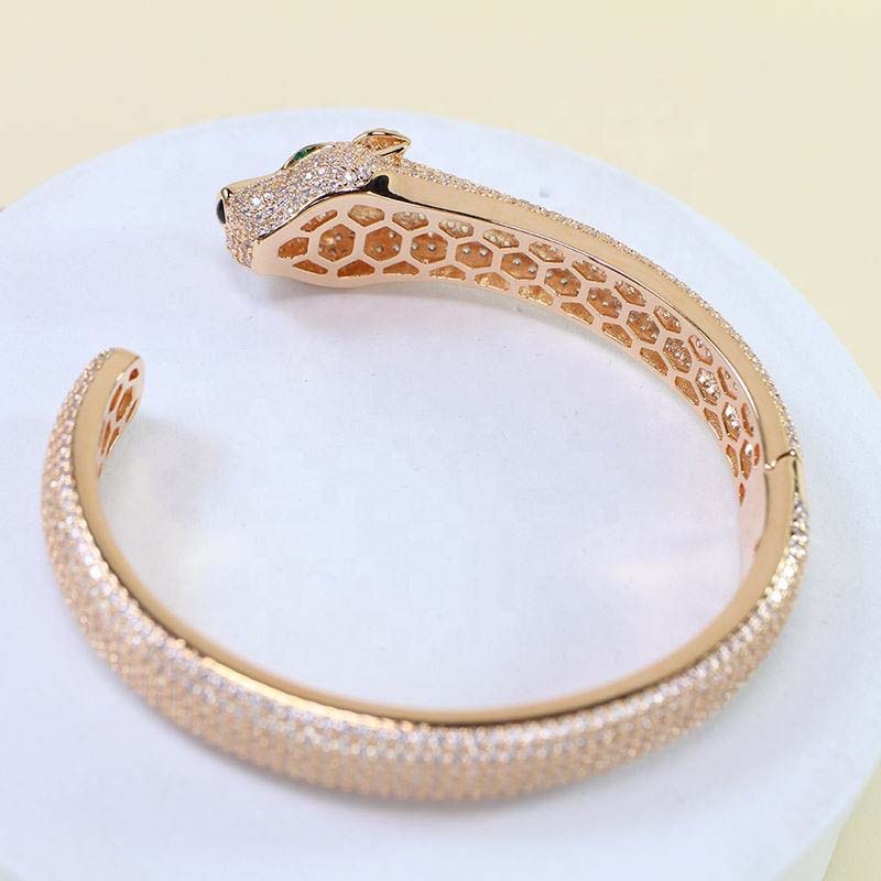 - Materials & Craftsmanship: Made of colored-plated alloy + fully inlaid imitation diamonds, the main body of the bangle is covered in diamonds, and the open end is designed as a 3D cheetah head (with green eye details). The imitation diamonds are sparkling and transparent, while the cheetah head has delicate and dimensional textures; the open design fits different wrist sizes, making it easy to wear and highly stylized.