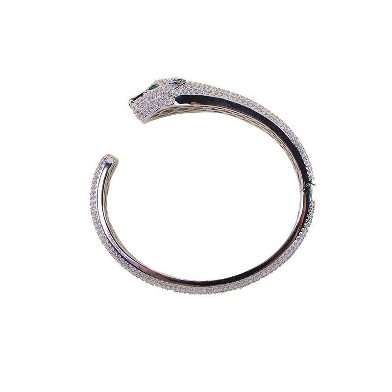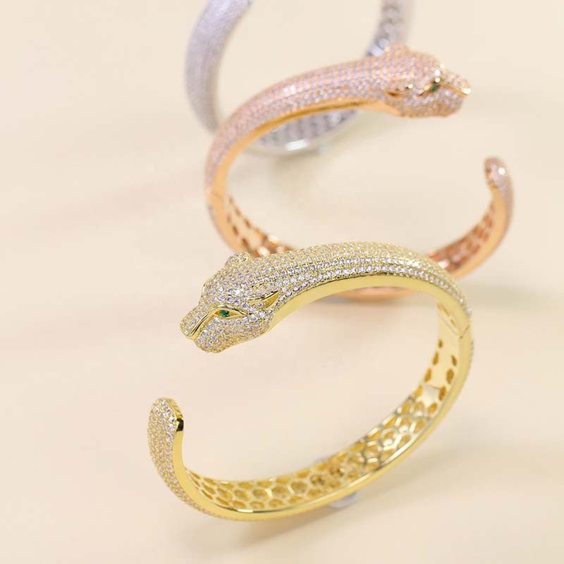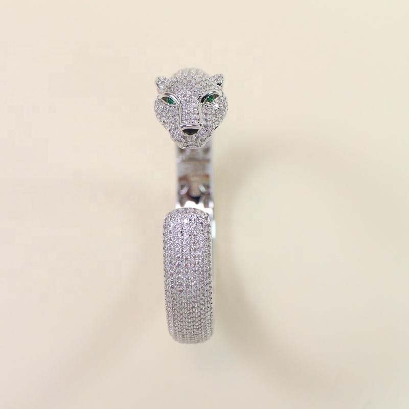 This is a cheetah-head full-diamond open bangle, available in silver, rose gold, and gold color options, featuring a wild and luxurious personalized edgy style. Here are its key highlights: