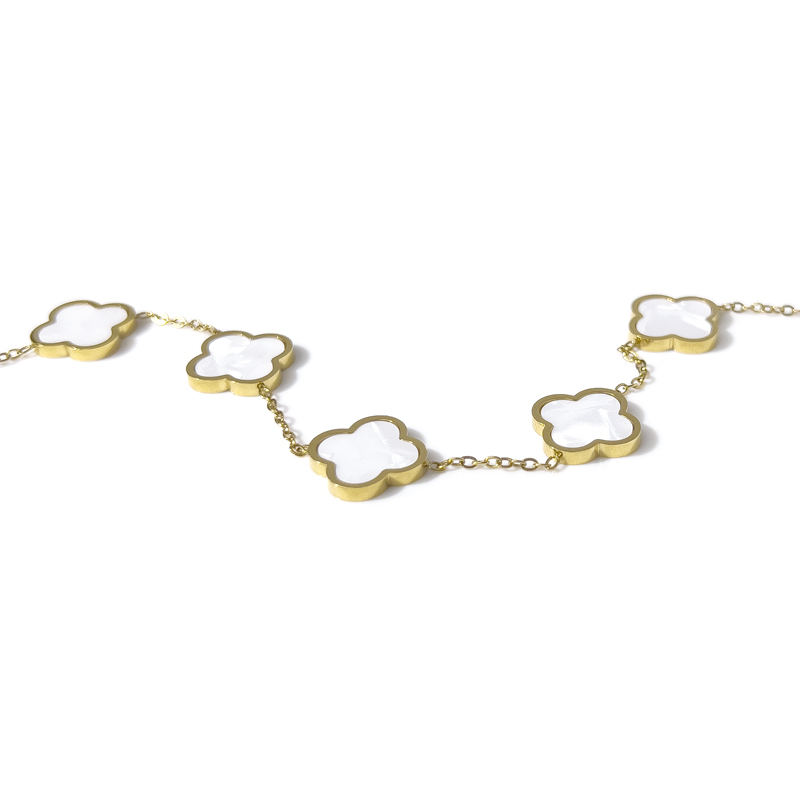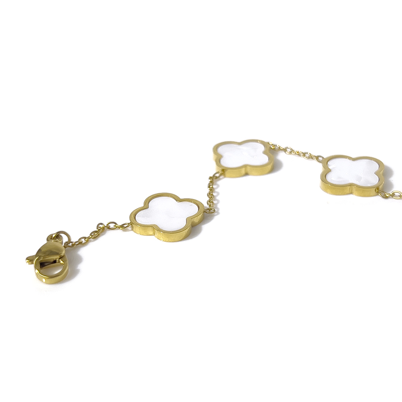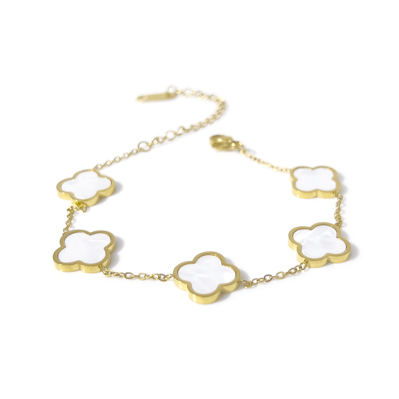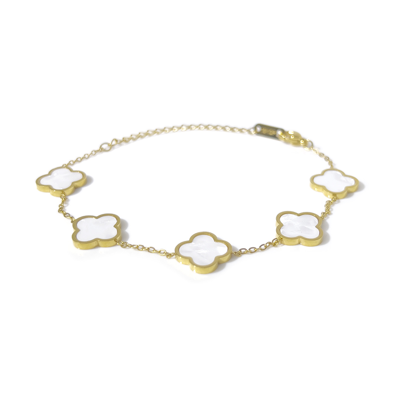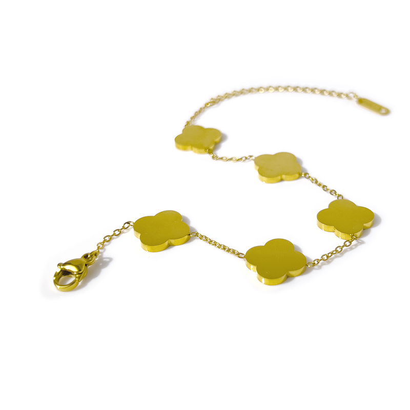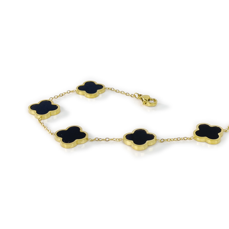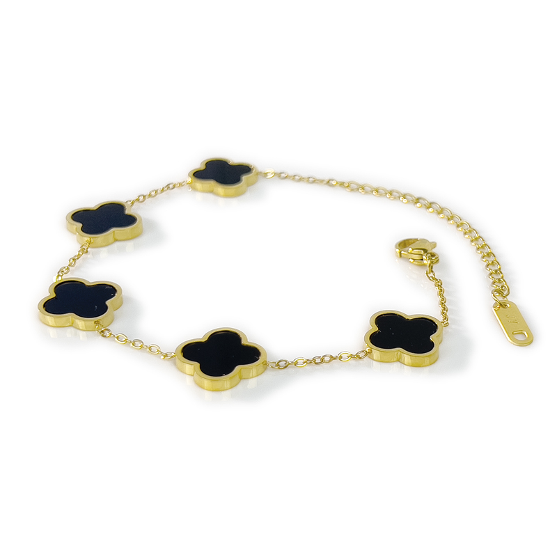 A delicate gilded chain strings together five ink-black clover charms— the matte black, like midnight cream, is edged with fine gold, weaving cool elegance around the wrist.