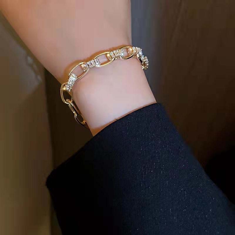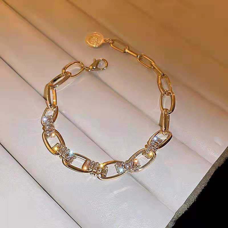 It combines “geometric chain links + zircon inlays”: the chain links are moderately thick with an openwork design, and zircons are set at the connections, keeping it simple but not plain. The bangle has an open/stretch design (fits most wrist sizes), making it easy to put on and take off, and it naturally conforms to the wrist’s shape.