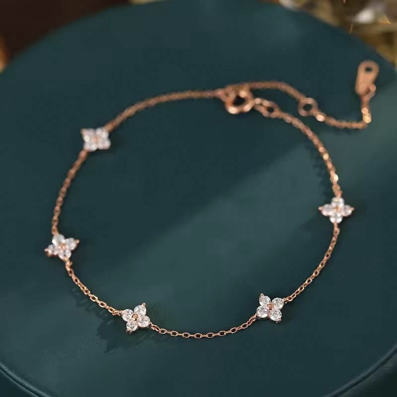 The core strength of this bracelet lies in “romantic details + lightweight texture”—the four-petal flower shape brings a romantic atmosphere, diamond accents elevate visual refinement, and the lightweight design balances comfort and styling impact. It’s an accessory that blends beauty and practicality.