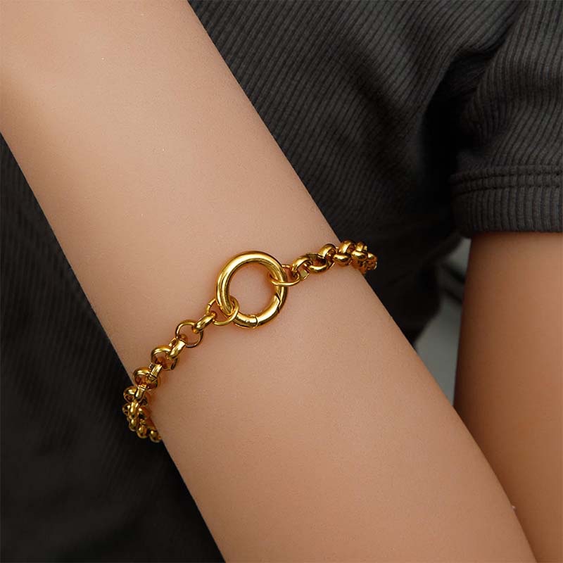 - Structure Design: The links feature a “hollow ring” shape—closely connected while maintaining a lightweight feel. It’s paired with a matching gold circle clasp, which serves as both a functional closure and an adjustable detail for fitting.