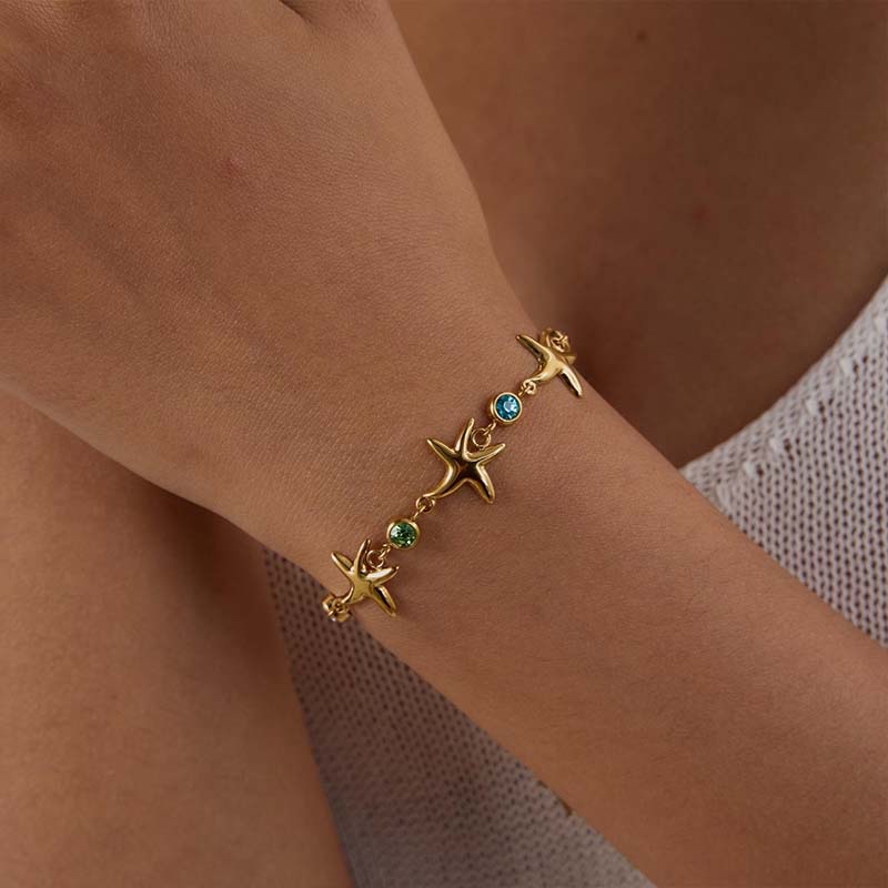 Built on a delicate gold chain, it’s adorned with 3 3D starfish-shaped accents, paired with small pink, blue, and green diamonds—like carrying the starlight and waves of the seaside on your wrist. The starfish feature a rounded, metallic texture, while the colorful diamonds add lively shimmer, balancing playfulness with refinement.