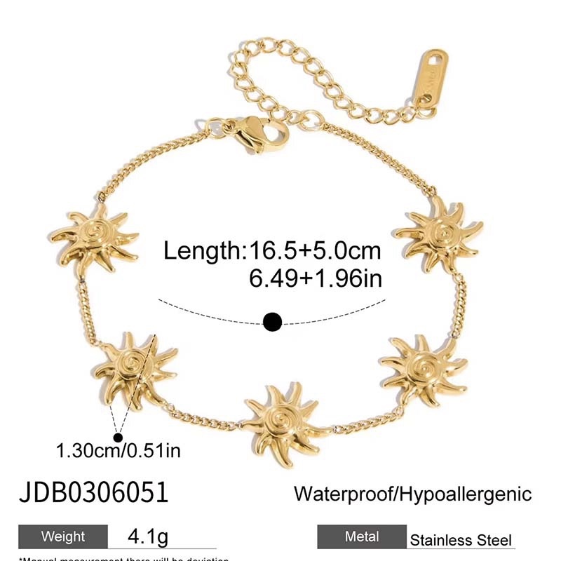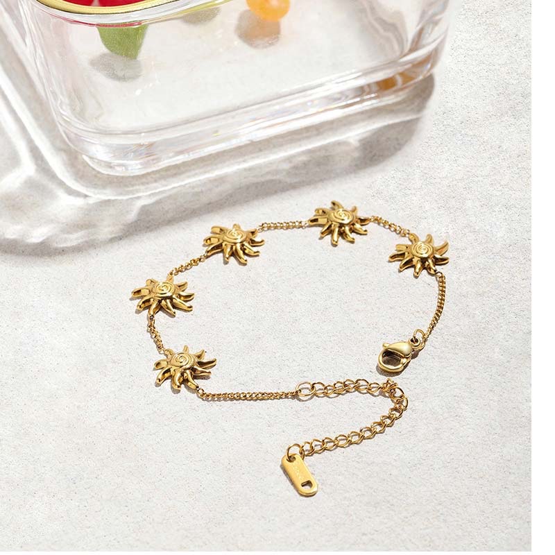 A bold gold-tone chain adorned with 5 3D sunburst charms — each features a spiral center and pointed rays, with textured details that add a retro, artistic vibe.