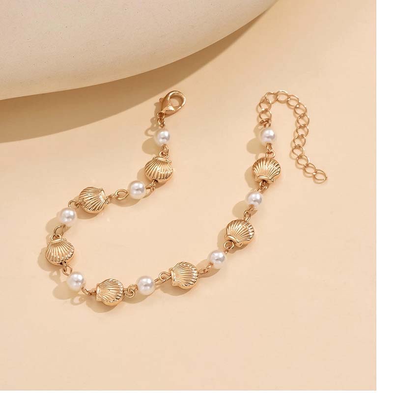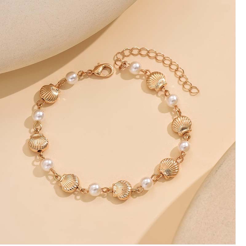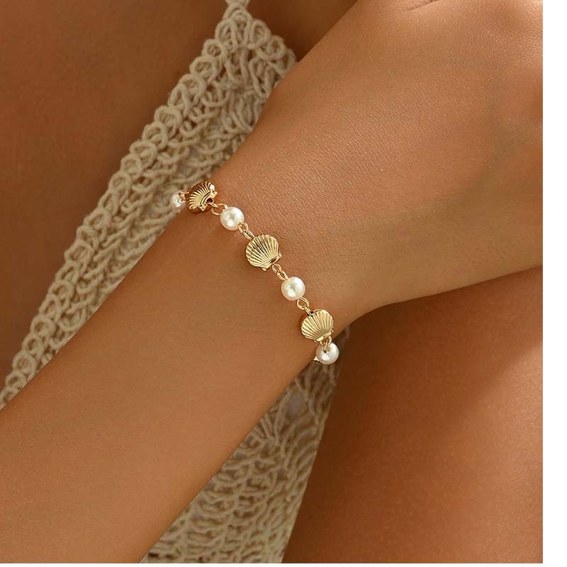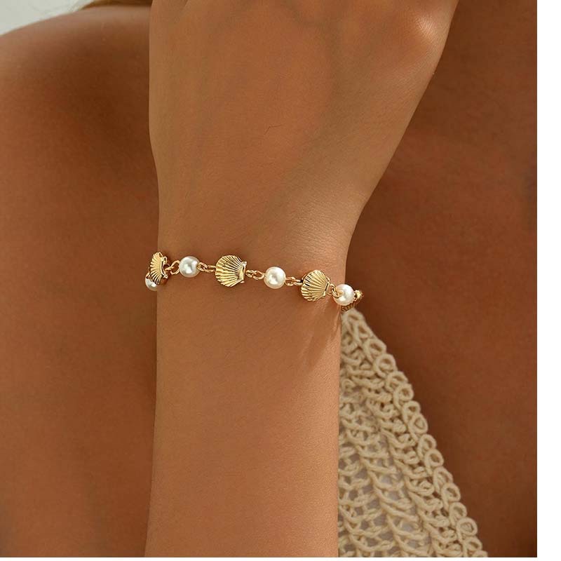 Combines shiny gold-plated seashell charms (with detailed texture) and round faux pearls,strung on a delicate gold chain — the marine elements + pearl elegance create a fresh,summer-ready look.